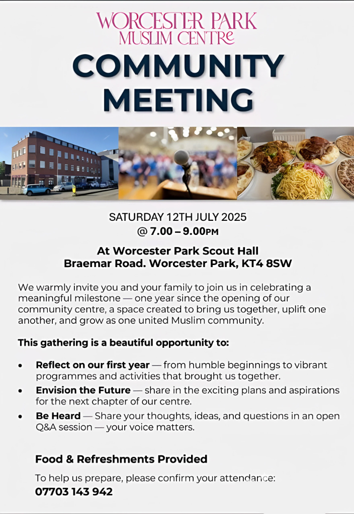 The meeting will be an opportunity to share and celebrate our achievements as a community over the recent year and together contribute to the future of our mosque.